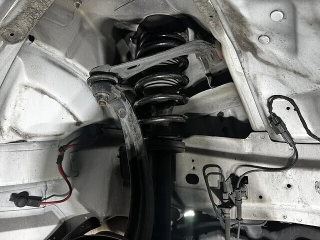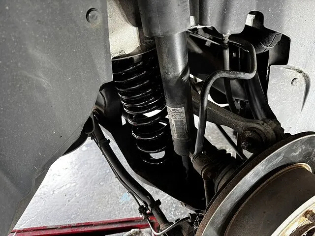 ホイールを取り外し、サスペンション、ブレーキ、各アーム類にガタや劣化がないかを点検した上で作業を開始。