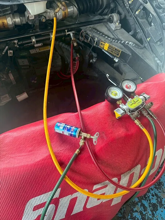 真空引きを行い、エアコンライン内部の空気と水分を完全に除去した後、新品のガスを充填します。